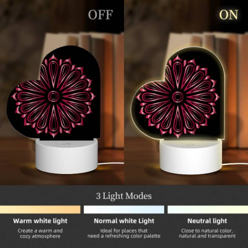 [Product Performance] The night light is composed of an acrylic light board and a plastic base. The night light has 3 light options (white light, warm light, warm white light). Touch to switch the light mode, which is soft and not dazzling, harmless to the eyes, and accompanies you into sweet dreams every night, creating a comfortable sleeping environment.