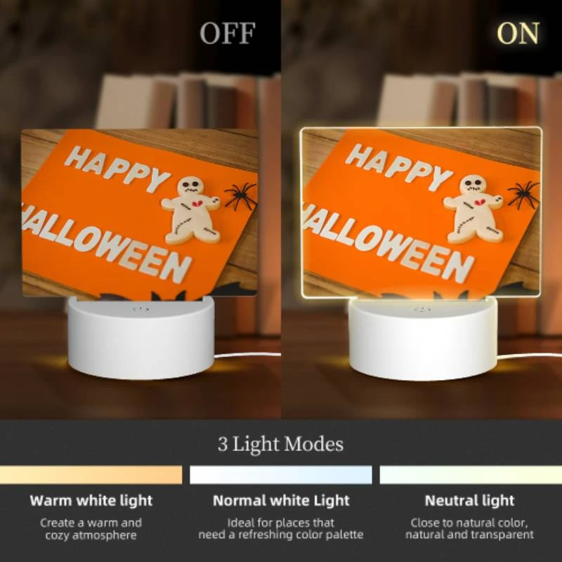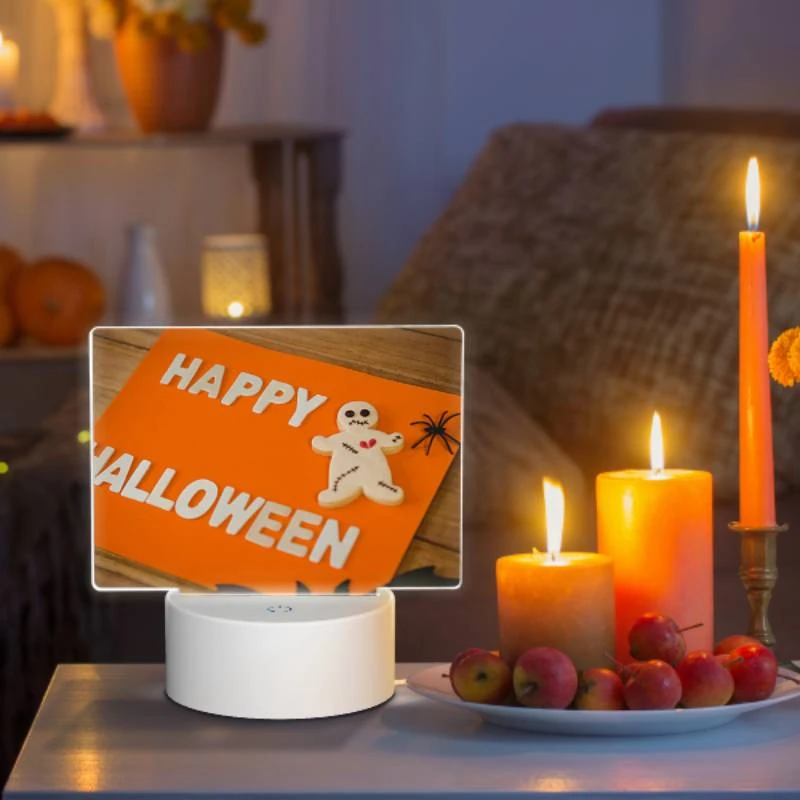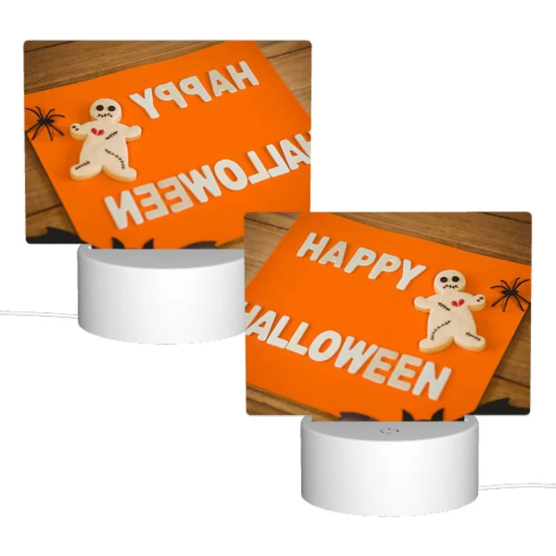 Rectangular Acrylic Night Light, A Happy Halloween Sign With A Gingerbread Man And A Spider.