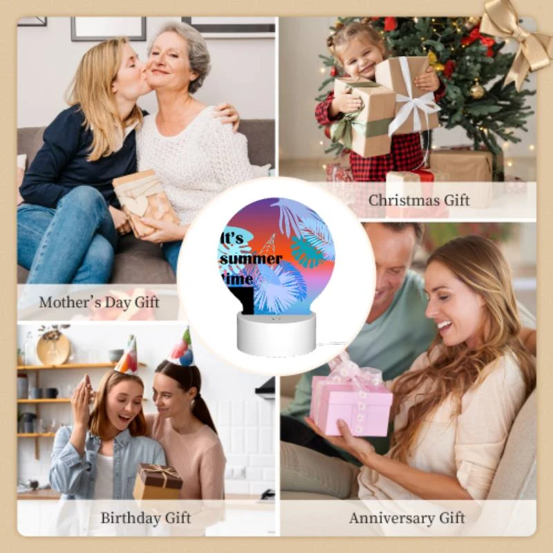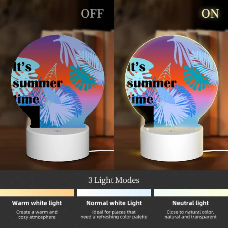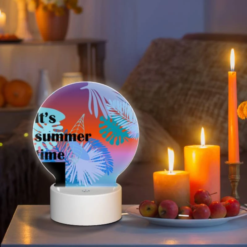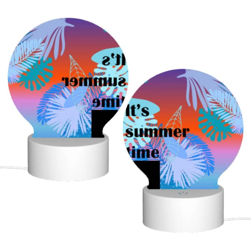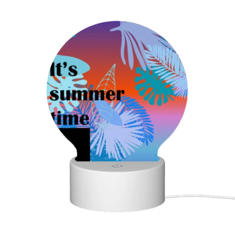 Round Acrylic Night Light, A Colorful Image Of A Palm Tree With The Words “It’s Summer Time” Written On It.