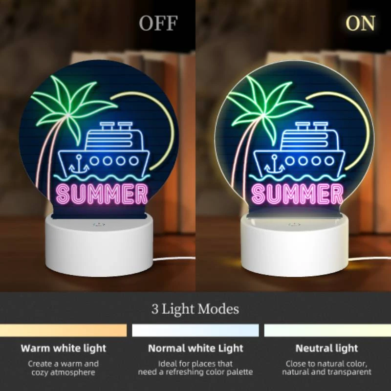 Round Acrylic Night Light, A Neon Sign That Says “Summer” With A Boat On It.