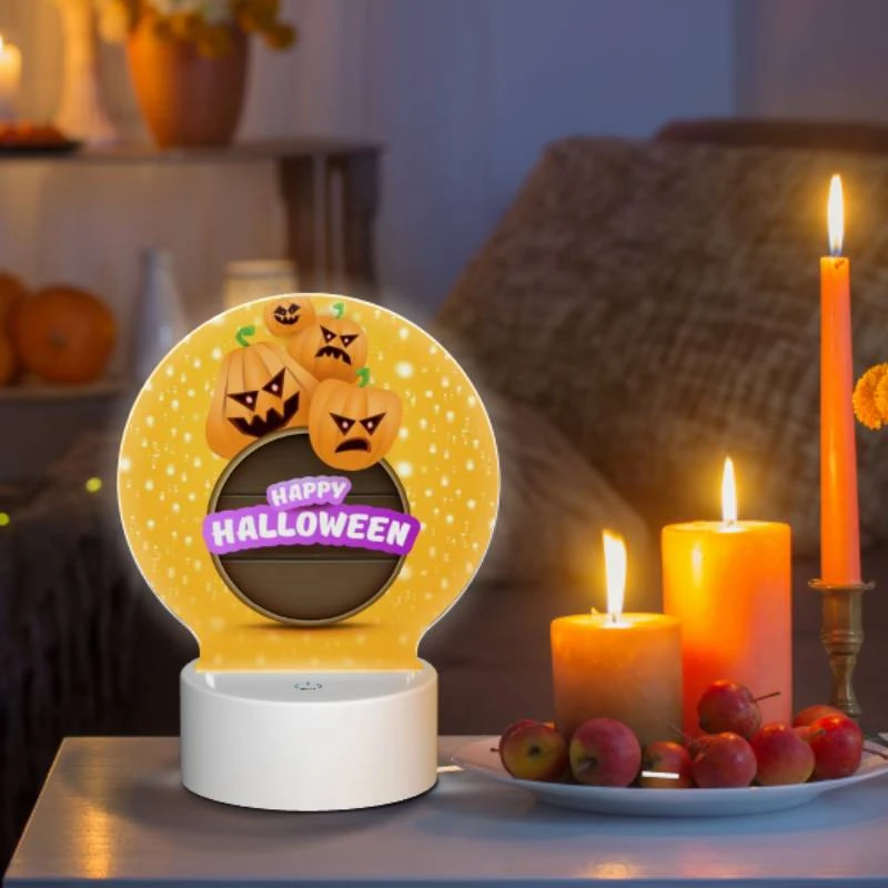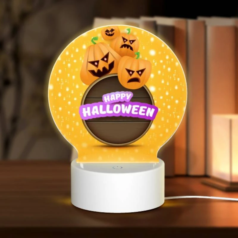 Round Acrylic Night Light, A Round Sign With A Bunch Of Pumpkins On It That Says “Happy Halloween”.