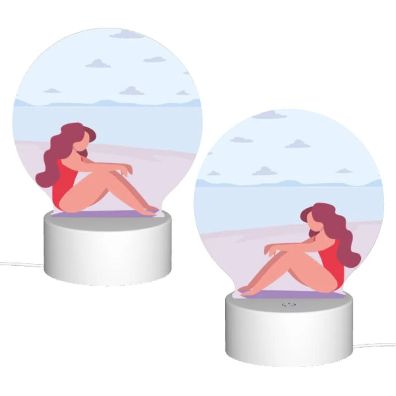 Round Acrylic Night Light, A Woman In A Red Bathing Suit Is Sitting On The Beach.